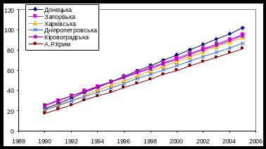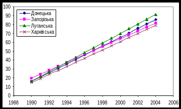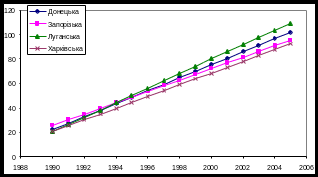Рис 3.1.4. Тенденції росту захворюваності в областях східної України
