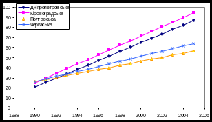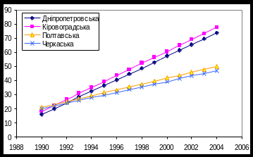 До центральної України відносяться такі області: Дніпропетровська, Кіровоградська, Полтавська та Черкаська. Тенденції росту захворюваності в цих областях мають лінійну залежність