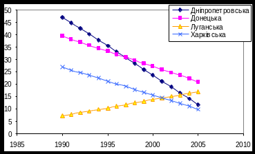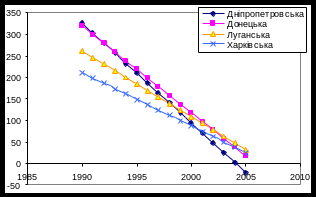 До східної України відносяться такі області: Дніпропетровська, Донецька, Луганська та Харківська. Тенденції спадання захворюваності в цих областях мають лінійну залежність