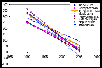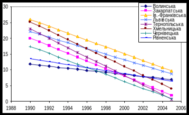 До західної України відносяться такі області: Волинська, Закарпатська, Ів.-Франківська, Львівська, Тернопільська, Хмельницька, Чернівецька та Рівненська області. Тенденції спадання захворюваності в цих областях мають лінійну залежність