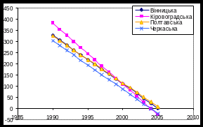 Рис 3.4.5. Тенденції спадання захворюваності в областях центральної України