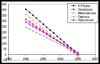 До південної України відносяться такі області: А.Р.Крим, Запорізька, Миколаївська, Одеська та Херсонська області. Тенденції спадання захворюваності в цих областях мають лінійну залежність