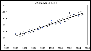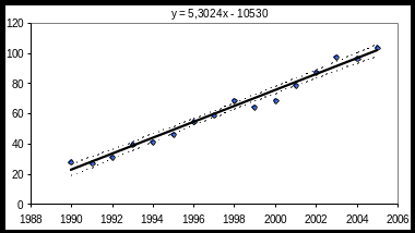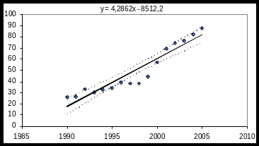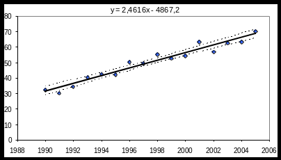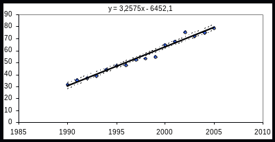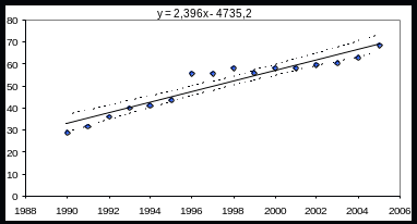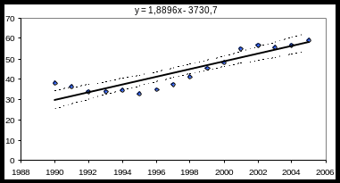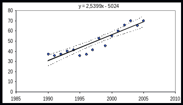Необхідно перевірити гіпотезу про наявність лінійної залежності між y- захворюваністю на туберкульоз на 100 000 населення та х – роком проведення спостереження, оцінити невідомі параметри