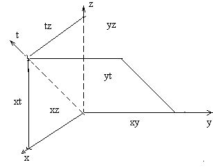 Для каждой из этих плоскостей переменные координаты могут принимать любые числовые значения, в том числе и нулевое. Например, точка (5, 0, 0, 0) принадлежит плоскости xy и плоскости xt. Тогда легко видеть, что, например, плоскость yz «проходит» через ось у в том смысле, что каждая точка этой оси принадлежит этой плоскости. Действительно, любая точка на оси у, т. е. точка вида (0, у, 0, 0), принадлежит множеству точек вида (0, y, z, 0), т. е. плоскости yz.