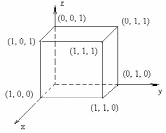 , содержит восемь вершин. Каждая из этих вершин есть точка (x, y, z), в которой x, y, z заменяются либо нулём, либо единицей. Получаем следующие 8 точек: