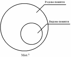 ідношення за об'ємом двох понять (відношення роду і вигляду) в логіці прийнято наочно зображати у вигляді кругів (кругів Ейлера), як це показано на мал. 7. При цьому родовому поняттю відповідає круг більшого діаметру, видовому — круг меншого діаметру. Це умовне зображення показує, що об'їм поняття, що є родовим, більше об'єму поняття, що є по відношенню до нього видовим. Воно показує також, що об'єм видового поняття — частина об'єму родового. Видові поняття, об'єм яких складає частину родового поняття, називаються підлеглими. По відношенню до родового, підпорядковує поняття вони знаходяться в підкоренні, а по відношенню один до одного — в супідрядності. А самі видові поняття, що мають загальний найближчий рід, називають супідрядними. При відношенні підкорення поняття підкоряються один одному як за об'ємом, так і за змістом. Підкорення за об'ємом розглянуто вище. За змістом це відношення встановлюється на основі загальної родової ознаки, що міститься у видовому понятті (як частини його змісту). Визначаючу роль грає зв'язок за змістом, тому що відношення за об'ємом встановлюється на основі родової ознаки, що міститься у всіх видових поняттях, що мають загальний рід. Але необхідно мати зважаючи на, що встановлення відношення між поняттями, як за об'ємом, так і за змістом — єдиний нероздільний процес. Відношення підкорення — дуже важливий вид відношення між поняттями. Неможливо дати жодного визначення, не підпорядкувавши видове поняття родовому. Будь-яке правильне визначення починається саме зі встановлення підкорення між видовим і родовим поняттям. Дати визначення — це значить знайти найближче родове поняття даного видового і вказати його видову відмінність, наприклад: «Динамометр є прилад для вимірювання сили». Тут найближче родове поняття «прилад», видова відмінність — «для вимірювання сили».