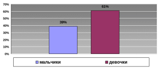 В анкетировании приняли участие учащиеся 8-9 классов. Выборочную совокупность составили 23 учащихся, в возрасте от 14 до 16 лет. Основную группу респондентов составляют девочки 14 учащихся (61%), 9 мальчиков (39%). Половая структура опрошенных представлена в диаграмме 7