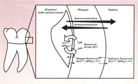 Величина рН, при которой происходит деминерализация или реминерализация зависит от концентрации кальция и фосфора в слюне и жидкости налета. Когда рН на поверхности эмали снижается, налет становится недосыщенным по отношению к минералам зубных тканей, что приводит к вымыванию их из эмали. Когда рН повышается, налет становится пересыщенным по отношению к минералу зубов, результатом чего является переход этих ионов из эмали в деминерализованные места.