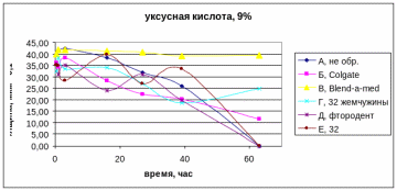 На графике изображена динамика разрушения скорлупы в растворе кислоты во времени. Несмотря на то, что во всех выбранных зубных пастах указывалось содержание фтора, действие которого направлено на укрепление зубной эмали в результате замещения гидроксильных групп на фтор, образуя фторапатит, который превосходит и по прочности и по кислотоустойчивости гидроксиапатит, не все они проявляли устойчивость к действию кислоты. Наиболее подвержены разрушению оказались необработанный образец, а также образцы, обработанные зубными пастами «32» и «Фтородент». Наилучшую защиту проявила паста «Blend-a-med» - даже по истечении 63 часов заметных изменений толщины скорлупы не наблюдалось. По истечении 168 часов все образцы растворились в уксусной кислоте, за исключением обработанного пастой «Blend-a-med», что говорит о ее неоспоримом преимуществе в вопросе защиты от воздействия кислой среды.