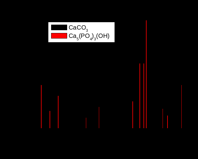 Рисунок – Рентгенофазовый состав, а) – рентгенограммы образцов (красная линия – зуб, черная – скорлупа), б) – набор межплоскостных расстояний для гидроксиапатита и карбоната кальция.