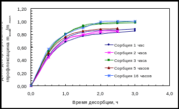 Полученные результаты показали, что степень десорбции ципрофлоксацина линзами за 30 мин составляет 50 – 60% от сорбированного, а также более высокому уровню сорбции соответствует большая степень десорбции. Причем, что при малых временах насыщения (1 – 2 часа), что при больших (3 – 16 часов) процесс десорбции идет одинаково быстро. Результаты десорбции за разное время сорбции находятся в пределах погрешности эксперимента (10-23%), поэтому можно говорить о том, что десорбция не зависит от размера МКЛ, ее массы.