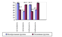 В результате тестирования контрольной и основной групп по методике Айзенка было выявлено, что в основной группе преобладают испытуемые с интровертируемым типом личности (60,3% при р<0,05) и нестабильным эмоциональным состоянием (67% при р<0,05), то есть отмечался повышенный уровень невротизации.