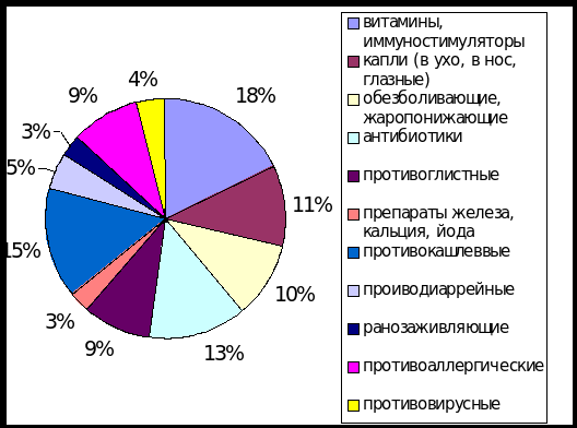 наибольшим спросом пользуются следующие фармакотерапевтические группы: 18% - витамины и иммуностимуляторы, 15% - противокашлевые, 13% - антибиотики;