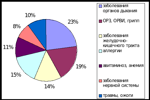 на первом месте среди заболеваемости детей находятся болезни органов дыхания – 23%, на втором – острые респираторные заболевания и грипп – 19%, третье место занимают аллергические заболевания – 15%;
