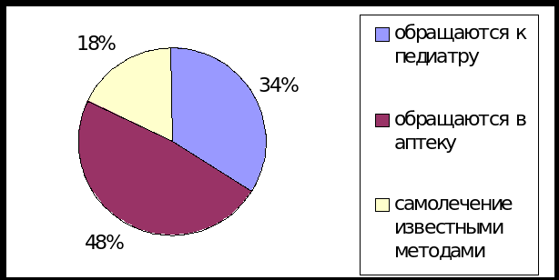 при недомогании ребенка в 48% случаев родители обращались в аптеку и лишь 34% - к педиатру, 18% лечили ребенка известными методами;