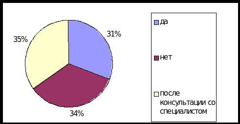На вопрос, влияет ли реклама в средствах массовой информации на выбор нужного лекарственного средства, ответили «да» 31%, «нет» 34%, 35% приобретают лекарственные средства после консультации со специалистом.