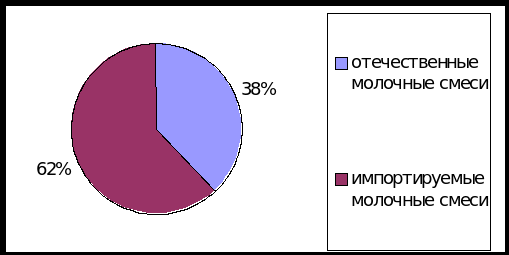 Наиболее часто использовались молочные смеси, импортируемые в нашу страну (62% опрошенных); отечественные молочные смеси использовались в 38% случаев.