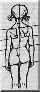 Вначале определяются косвенные признаки, по которым можно предположить наличие сколиоза: асимметричное положение пояса верхних конечностей (разный уровень стояния надплечий и нижних углов лопаток, неодинаковая величина шейно-плечевых углов), неравномерность треугольников талии, разный уровень стояния гребней подвздошных костей и ягодичных складок.