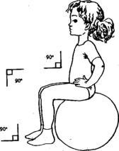 Для занятий с детьми до 7 лет лучше всего подойдет мяч диаметром 45-55 см. Выбор мяча зависит от роста ребенка, высота мяча должна быть такой, чтобы в положении сидя на мяче между туловищем и бедром, бедром и голенью, голенью и стопой соблюдался угол 900 (то есть на мяче ребенок должен сидеть, как на стуле). (Рис А).
