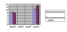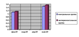 Анализ динамики изменений гибкости представлен на рисунке 5. В контрольной группе улучшение результата составило ____, в экспериментальной группе ____. Если в начале экспериментальной работы результаты по исследуемому критерию отличались на ___, то по его окончании отличие составляло ____. Несмотря на незначительное улучшение показателя в экспериментальной группе, согласно t-критерия Стьюдента, достоверных отличий, как и в начале исследования, между группами не имеется.