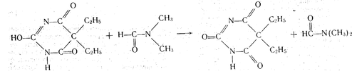 Основные (протофильные) растворители легко присоединяют протоны, усиливают кислотные свойства титруемых веществ. Среди них — диметилформамид НСОN(СН3)2, пиридин, жидкий аммиак и др. В среде основных растворителей легко титруются слабые кислоты, кислые формы .барбитуратов, сульфаниламидов, фенолы. Кислотность этих соединений в среде данных растворителей повышается, и тем самым улучшается процесс и результаты титрования. Титрантом служит раствор гидроксида натрия в смеси метанола и бензола или раствор метилата натрия. В качестве индикатора применяют тимоловый синий. Например, при титровании барбитала в среде диметилформамида раствором гидроксида натрия происходят следующие процессы: