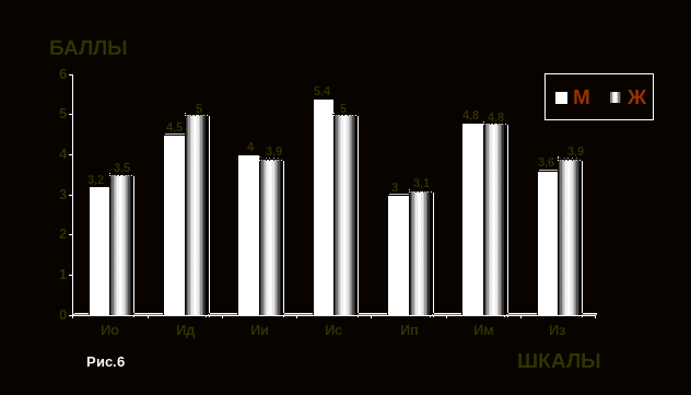 | Шкалы/ Средние значения Неуверенность Замкнутость Уход от реаль- (Н) (З) ности (Р) _______________________________________________________ Номера шкал 1 2 3 ----------------------------------------------------------------Средние значения мужчин 19. 2.01 8.1 1.3 7.2 1.4 Средние значения женщин 18.9 1.6 7.7 1.2 7.2 1.6 |