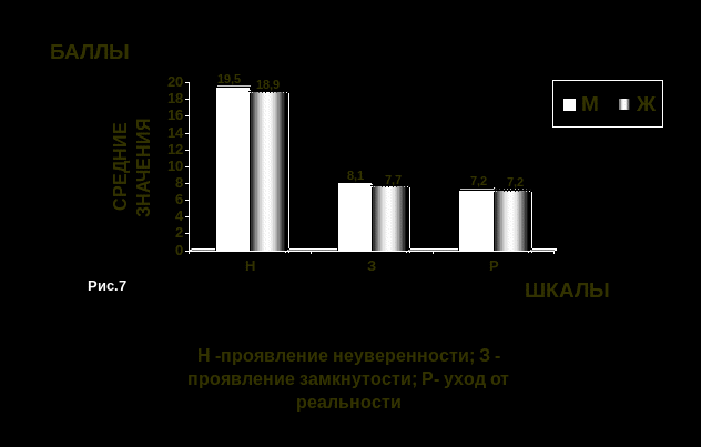 Высокие значения по шкале «уход от реальности» свидетельствует о наличии в личностной структуре испытуемых острого ощущения зависимости от окружающей реальности, игнорирования традиционных вещей, бегства от действительности, фиксации на прошлом и будущем, сильного желания избежать неприятной ситуации, а также фиксации на размышлениях и фантазиях (рис.7).