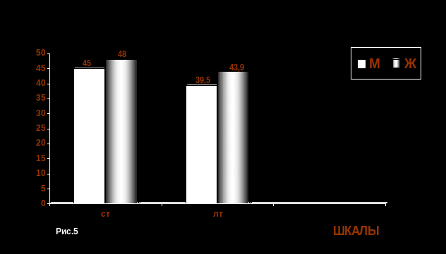 | Шкалы/Средние значения СТ ЛТ ____________________________________________________ Номера шкал 1 2 ---------------------------------------------------- Средние значения мужчин 45.8 9.9 39.5 9.5 Средние значения женщин 48.0 7.6 43.9 9.1 |