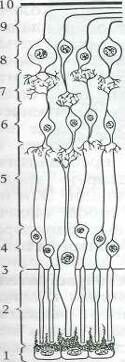 Пройдя через стекловидное тело и достигнув сетчатки, свет не сразу попадает на фоторецепторы, так как они лежат в глубине, где непосредственно примыкают к пигментному слою сетчатки. Чтобы достичь фоторецепторов, свет должен сначала пройти через слой нервных волокон и нервных клеток во внутренних частях сетчатки (частях, прилежавших к стекловидному телу). Затем, когда свет дойдет до фоторецепторов сетчатки и подействует на них, нервные импульсы, вызванные световым стимулом, должны пройти в обратном направлении через нервные волокна и тела нервных клеток к стекловидному телу. Здесь в ближайшем к нему слое сетчатки импульсы проводятся нервными волокнами, идущими к месту выхода зрительного нерва, по которому они достигают головного мозга (см. рис.4).