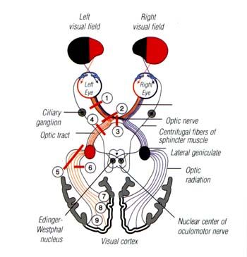 Информация, полученная при помощи аппарата глазного яблока, передается по зрительным путям (зрительный нерв, перекрест зрительных нервов, зрительный тракт) сначала в подкорковые центры зрения (наружные коленчатые тела), затем по зрительной лучистости и зрительному пучку Грациоле в высший зрительный центр в затылочных долях головного мозга.