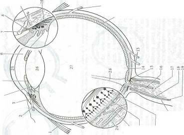 1 наружная мышца, 2-передняя цилиарная артерия, 3-цилиарное тело, 4-задняя камера, 5-радужка, 6-передняя камера, 7-шлеммов канал, 8-гребешковая связка, 9 - склеральная шпора, 10-цилиарная мышца, 11-вортексная вена, 12-сетчатка, 13-задние цилиарные артерии, 14-желтое пятно, 15-решетчатая пластинка склеры, 16-центральные сосуды сетчатки, 17-зрительный нерв, 18-мягкая мозговая оболочка, 19-паутинная оболочка, 20-твердая мозговая оболочка, 21-слоя нервных клеток, 22 - пигментный слой, 23 - сосудистая оболочка, 24-склера, 25-роговица, 26-хрусталик, 27-стекловидное тело, 23-канал Клоке.