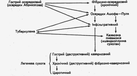 Патологічна анатомія. Розрізняють вісім форм вторинного туберкульозу, кожна з них є подальшим розвитком попередньої форми (схема 3). У зв'язку з цим форми вторинного туберкульозу є одночасно й фазами його розвитку (форми-фази). Серед форм-фаз вторинного туберкульозу розрізняють: 1) гострий осередковий; 2) фіброзно-осередковий; 3) інфільтративний; 4) туберкулому; 5) казеозну пневмонію; 6) гострий кавернозний; 7) фіброзно-кавернозний; 8) циротичний.