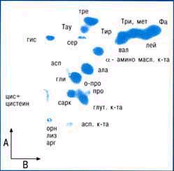 Разработка методов количественного и качественного анализов аминокислот (АК) является важной задачей многих отраслей науки: медицины, биохимии, микробиологии, пищевой промышленности, фармакологии и сельского хозяйства. В настоящее время наиболее эффективно при массовых анализах может быть использована тонкослойная хроматография [12] (ТСХ). Денситометрия применяется для количественной тонкослойной хроматографии в качестве альтернативы методу высокоэффективной жидкостной хроматографии (ВЭЖХ), требующей дорогостоящего оборудования и расходных материалов. Применяют методы разделения свободных аминокислот и их производных с использованием одномерного и двухмерного вариантов тонкослойной хроматографии с последующей денситометрической обработкой хроматограмм. Программа "Dens" позволяет обрабатывать хроматограммы, полученные в двух вариантах с относительной погрешностью не более 3%. Двухмерная ТСХ дает возможность разделить большое количество соединений (до 22 наиболее важных аминокислот, в том числе и таурин) на коротком расстоянии проявления (стандартная пластина размером 10х10 см). Одномерная ТСХ позволяет анализировать до десяти и более образцов аминокислот одновременно. В работе [12] показана возможность разделения смеси 22-х свободных аминокислот методом двухмерной ТСХ (рис. 1.1).