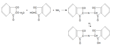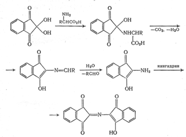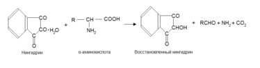 Растворы аминокислот, полипептидов, пептонов и первичных аминов при нагревании с нингидрином (1,2,3-индантрион) (НГ) приобретают синюю или фиолетовую окраску. Реакции между НГ и указанными соединениями протекают сложно (вещества претерпевают глубокое превращение). Предполагают, что сначала НГ восстанавливается, а аминокислоты окисляются, что сопровождается их декарбоксилированием и дезаминированием.