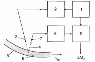 Блок-схема непрерывноволнового доплеровского прибора приведена на рис.1. Задающий генератор 1 вырабатывает синусоидальную волну, поступающую на усилитель мощности 2 и далее на передающий пьезоэлемент 3, который создает непрерывную ультразвуковую волну 4.