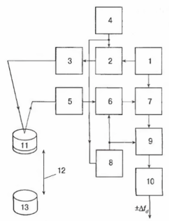 Рис. 2. Блок-схема импульсного доплеровского прибора.1 - задающий генератор; 2 - селектор передачи; 3 - усилитель мощности; 4 - генератор импульсов; 5 - предусилитель; 6 - селектор по дальности; 7 - когерентный демодулятор; 8 - селектор задержки; 9 - схема выборки хранения; 10 - полосовой фильтр; 11 - датчик; 12 - выбранная дальность; 13 - объем выборки.