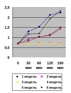 Рисунок 5 - Результат исследования биологической доступности мази мумие с добавкой глицерина к бентонитовой основе (модель 3) На рисунках 6, 7, 8, 9 представлены результаты исследования биологической доступности мазей мумие моделей 1, 4, 5, 6.