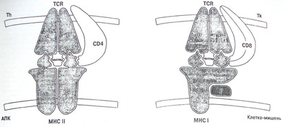 Рисунок 4. Распознавание комплекса антигенного пептида с молекулами МНС I и II класса рецептором и корецептором Т-лимфоцита.