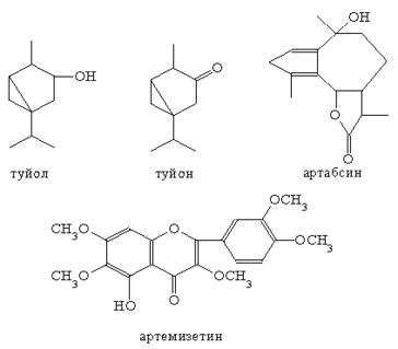 Химический состав. Трава и листья полыни горькой содержат 0,5-2% эфирного масла, в состав которого входят бициклические монотерпены - туйол (10-25%), туйон (около 10%), пинен и др.; а также азуленогенные сесквитерпеновые лактоны, которые придают траве своеобразный горький вкус – артабсин, абсинтин (димер артабсина). Кроме того, содержатся флавоноиды (артемизетин и др., проявляющие в эксперименте противоопухолевую активность) и другие вещества.