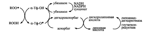 Рис.4. Окислительно-восстановителные превращения α-токоферола и сопряженных с ним коантиоксидантов [Меньщикова с соавт., 2006].