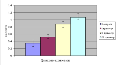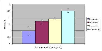 В III триместре содержание ДК в плазме крови беременных женщин достигает своего максимума и составляет 1,07 ммоль/л. Уровень МДА так же повышается по сравнению с контролем и вторым триместром на 160 и 31% соответственно.