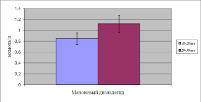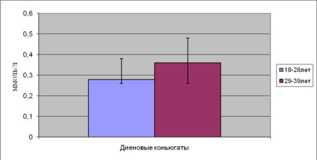 В возрастной подгруппе от 18 до 28 лет содержание ДК составило 0,28 ммоль/л, а в возрастной подгруппе от 29 до 39 лет концентрация увеличилась на 28%. Та же закономерность выявлена и в содержании МДА.