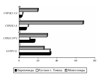 В целом, результаты анализа частот аллелей и генотипов генов GSTT1, GSTM1, GSTP1, CYP2E1 и CYP2C19 у жителей г. Томска показывают значения близкие для европеоидных популяций, что закономерно, так как этническая принадлежность была одним из основных критериев отбора для исследования.