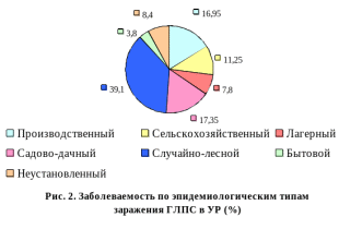 По классификации Мясникова Ю.А. различают шесть основных эпидемиологических типов заражения ГЛПС по условиям, в которых оно произошло. Для каждого из них характерна своя сезонность, состав заболевших по полу, возрасту, роду занятий и свой комплекс профилактических и противоэпидемических мероприятий. Заражения в быту – бытовой тип – происходят, когда человек живет непосредственно в лесу (кордоны, железнодорожные будки) или когда мышевидные грызуны мигрируют поздней осенью из леса в ближайшие поселки. Заражения, связанные с производственной деятельностью, проходящей в лесу, относятся к производственному типу. Заражения во время сельскохозяйственных работ – сельскохозяйственный тип – происходят при перевозке сена и соломы из леса или от леса, при работе с ними на фермах, при уборке льна, при разработке зимовавших буртов картофеля. Заражения в коллективных садах, огородах и пасеках, относящиеся к садово-дачному типу, весьма обычные для Удмуртии. В оздоровительных учреждениях заражение происходит лагерным типом. Самые многочисленные заражения при случайных посещениях леса, относящиеся к лесному типу (случайно-лесной). Соотношение повторяемости типов заражения показано на рис.2.