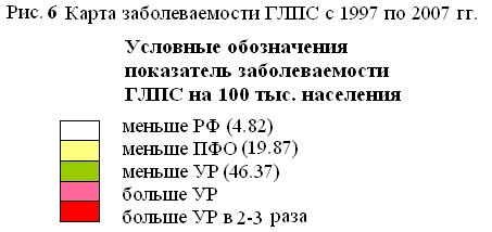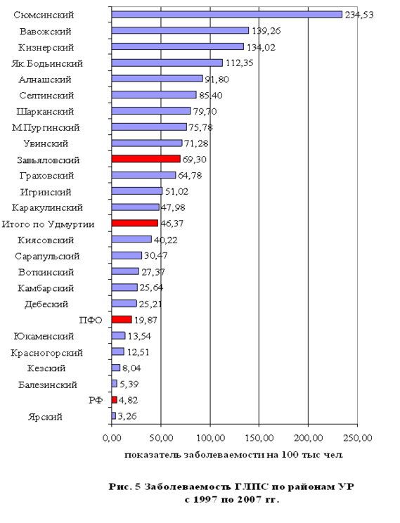 Сравнивая уровень заболеваемости ГЛПС на территории республики за 1991-1993 года и 2001-2003 года (см. карту 1 и 2), на картах видно, что за 10 лет природные очаги инфекции занимают практически всю территорию. Районы Юкаменский, Кезкий, Селтинский, Камбарский, раннее малоактивные, сейчас их показатель составляет от 5 до 20-30 на 100 тыс. населения. Повышению заболеваемости ГЛПС в этих районах в определенной мере могли способствовать мероприятия по широкому освоению земель под садоогороды, дачные участки, гаражи без проведения предварительной профилактической дератизации этих территорий.