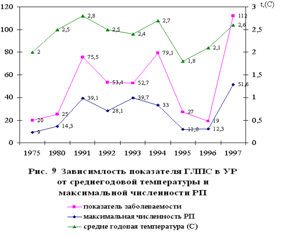 Как известно, показатель заболеваемости людей ГЛПС тем выше, чем выше число носителей инфекции – в случае с УР – рыжих полевок. В условиях с наиболее благоприятным климатом для ранневесеннего размножения и происходит большее число заражений. Для подтверждения этого факта сделан график, на котором хорошо видна зависимость между среднегодовой температурой, численностью РП и показателем заболеваемости. Анализ проведен с 1975 по 1997 гг. по данным предоставленным кафедрой Экологии животных УдГУ, дальнейшую динамику проследить не удается за неимением информации по численности РП. (Рис.9) .