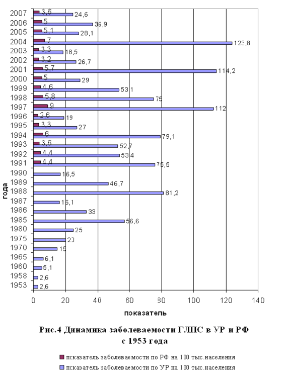 До 1985 года показатель заболеваемости ГЛПС колебался в пределах 15-30 на 100 тысяч населения. В 1985 году по республике он составил 56,6, и в последующие годы то увеличивался, то уменьшался, но ниже 15,0 уже не опускался. В 1997, 2001 и 2004 годах показатель достиг небывалых значений – 112,0; 114,17; 123,8 (обусловлено благоприятными погодными условиями зимы, достаточная кормовая база привели к подснежному размножению грызунов и активной эпизоотии ГЛПС среди них), в то время как в среднем по России показатель был равен 5-9. Рис.4