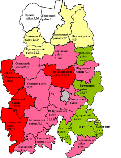 К районам с наивысшими средним показателями (за период 10 лет) относятся: Сюмсинский (234,53), Вавожский (139,26), Кизнерский (134,2), Якшур-Бодьинский (112,35), Алнашский (91,8), Селтинский (85,4), в то время как показатель федерального уровня составляет около 4,82 на 100 тыс. населения. Эти районы каждый год в числе первых по показателю заболеваемости в Государственных докладах о состоянии здоровья населения Удмуртской республики. Такая ситуация складывается вследствие того, что данные районы располагаются в пределах ценрально-западной и юго-восточной части республики. В лесах преобладают широколиственные породы с достаточно высоким содержанием липы в древостое – 11 %. В целом залесенности территории невелика от 7 до 17 %, лишь в юго-западной и западной частях леса покрывают 25 % территории.
