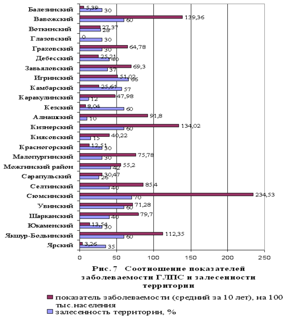 В целом можно сделать вывод, что практически во всех административных районах Удмуртии случаи заражения зарегистрированы. Территория Удмуртской республики благоприятна для обитания и размножения главных носителей вируса ГЛПС – грызунов: площадь залесенности и состав древесных пород, климатические условия и т.д.
