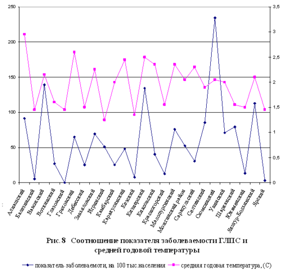 Также немаловажную роль играют климатические условия территории. Корреляционный анализ между среднегодовой температурой и уровнем заболеваемости выявил прямую, но слабая зависимость. (0,47) Рис.8